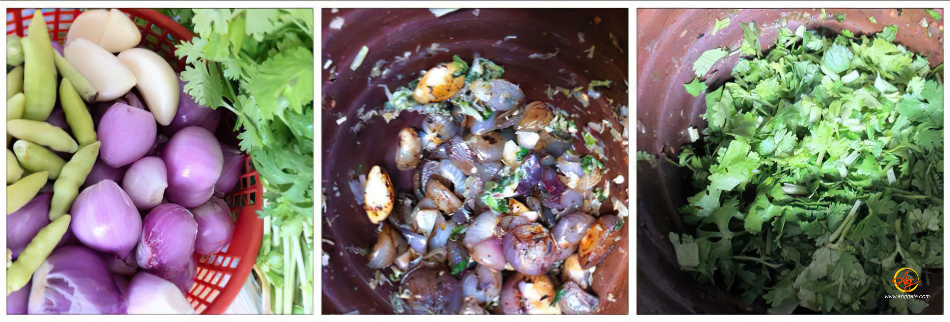 4. โขลก (ตำ) รากผักชีหั่นฝอย ให้ละเอียด แล้วโขลกเครื่องย่าง (พริกสด หอมแดง กระเทียม) ลงไปรวมกันให้ละเอียด