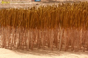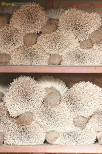 จากนั้นก็คลึงก้านธูปด้วยมือ เพื่อลดฝุ่นและทำให้ผงซังข้าวโพดจับก้านสม่ำเสมอ แล้วนำไปตากแดดให้แห้ง แล้วเอามาลูบยางโกบ๊วะ แล้วจิ้มใหม่ คลึงใหม่ ไปตากแดด ... แบบนี้ทำไป 4 รอบ กว่าจะได้ธูปมาก้านนึง ... โห!!! ถ้าแดดจัดๆ 4 รอบที่ว่า จะทำเสร็จในวันเดียว ... แต่ถ้าฝนตก ไม่ต้องทำธูปกันเลยล่ะค่ะ