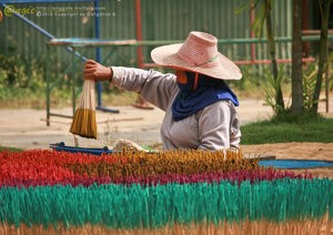 ทีนี้เวลาจะใส่สี ใส่กลิ่น ก็เอาธูปขาวๆ นั่นไปจิ้มในถังสี แล้วไปปักตากแดดที่ลานกลางแจ้ง และถังสีนั้นก็จะใช้น้ำมันหอมระเหยกับสีผสมอาหาร แยกสีแยกกลิ่นกันไป