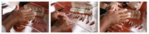 แล้วก็นำไปใส่แม่พิมพ์ที่ทำด้วยเรซิน (ใสๆ เพื่อให้มองเห็นข้างใน) เทคนิคตอนนี้ พี่เค้าบอกว่า กำแม่พิมพ์ให้แน่น แล้วหยอดปลายแหลมๆ ลงไป กดให้แน่น เต็มแม่พิมพ์ ส่วนที่เกินก็หยิบออก