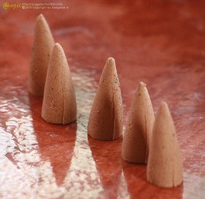 ด้วยความเคยชินว่า กำยาน (ที่เคยใช้) เป็นขดๆ แบบยากันยุง แล้วมีที่วางแบบเฉพาะเจาะจง โดยขดกำยานมันจะถ่วงๆ ลงมา แล้วเป็นรูปทรงเหมือนเจดีย์ทรงสามเหลี่ยม .. ![]()